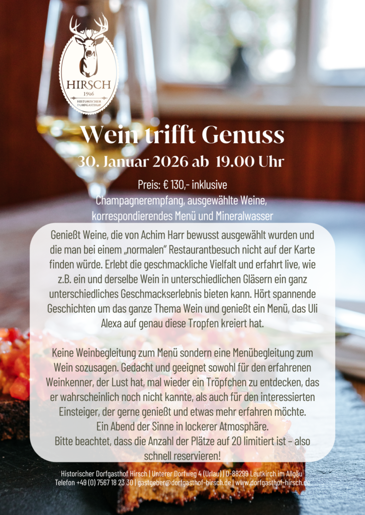 Genießt Weine, die von Achim Harr bewusst ausgewählt wurden und die man bei einem „normalen“ Restaurantbesuch nicht auf der Karte finden würde. Erlebt die geschmackliche Vielfalt und erfahrt live, wie z.B. ein und derselbe Wein in unterschiedlichen Gläsern ein ganz unterschiedliches Geschmackserlebnis bieten kann. Hört spannende Geschichten um das ganze Thema Wein und genießt ein Menü, das Uli Alexa auf genau diese Tropfen kreiert hat.